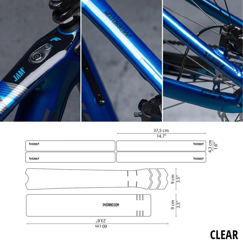 Protégez votre vélo des rayures avec ce kit de protection du cadre. Protection de cadre transparente avec logo DYEDBRO imprimé en blanc.